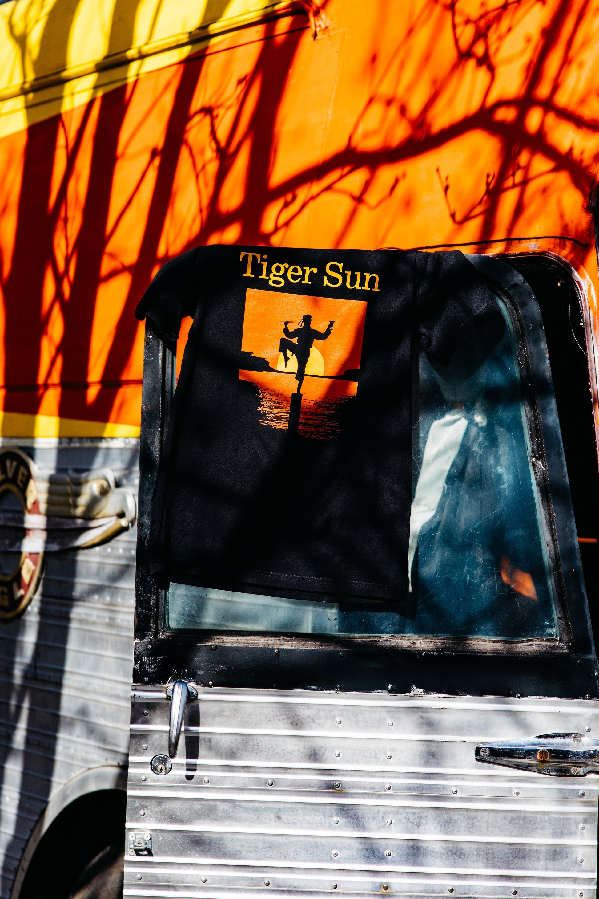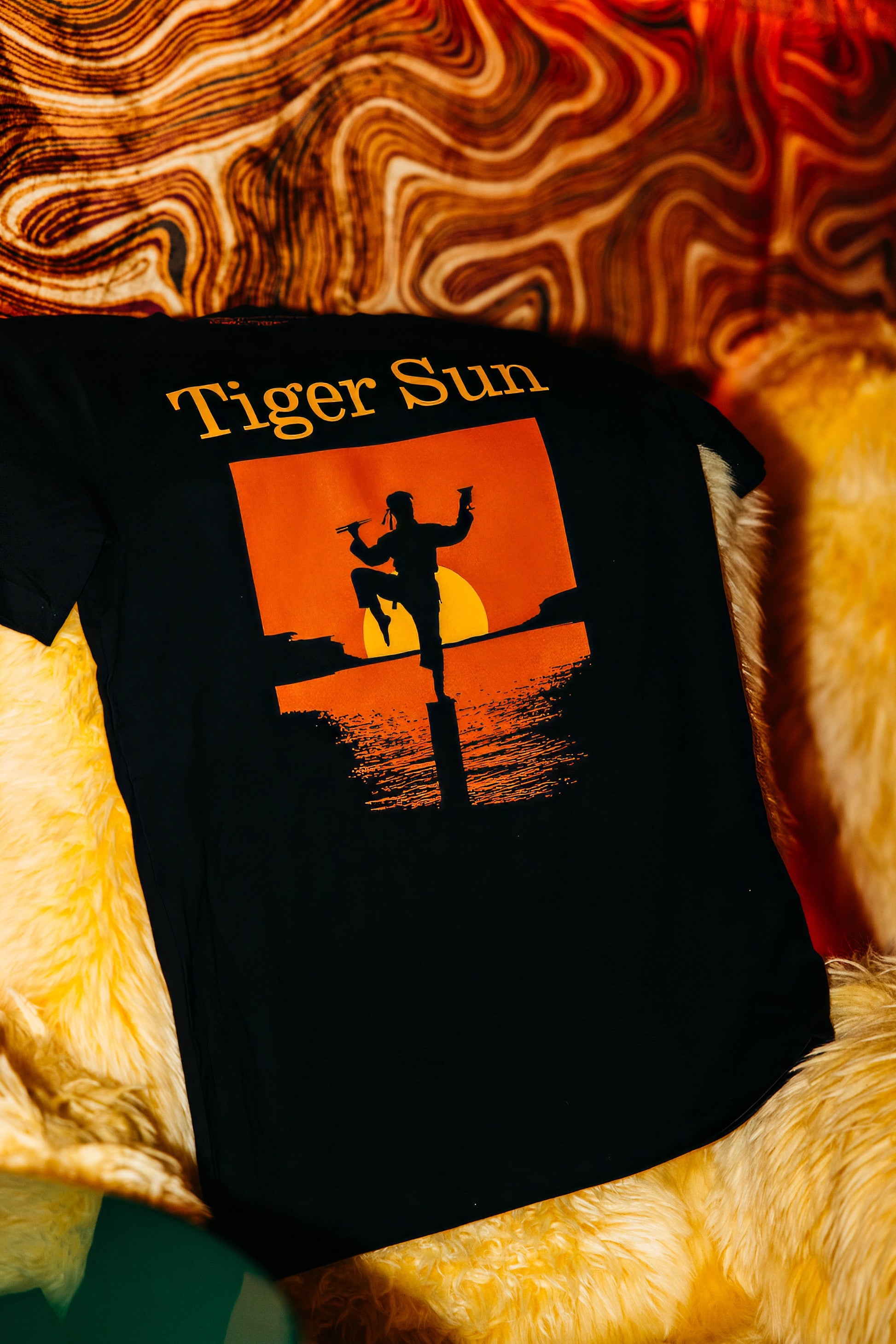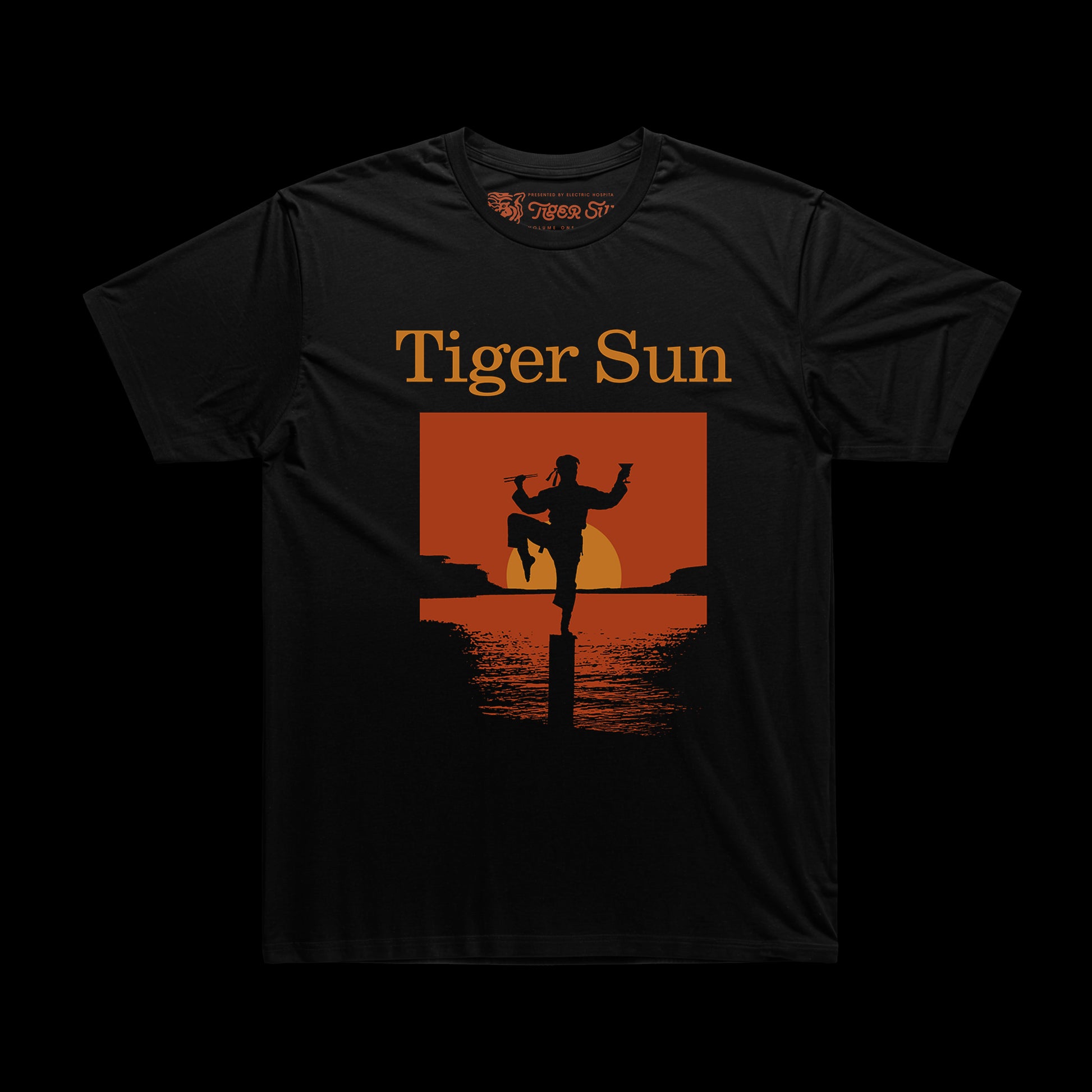 Wax on, wax weird with our "Tiger Sun" tee! This black beauty showcases a martial arts master doing the famous flamingo pose at sunset.